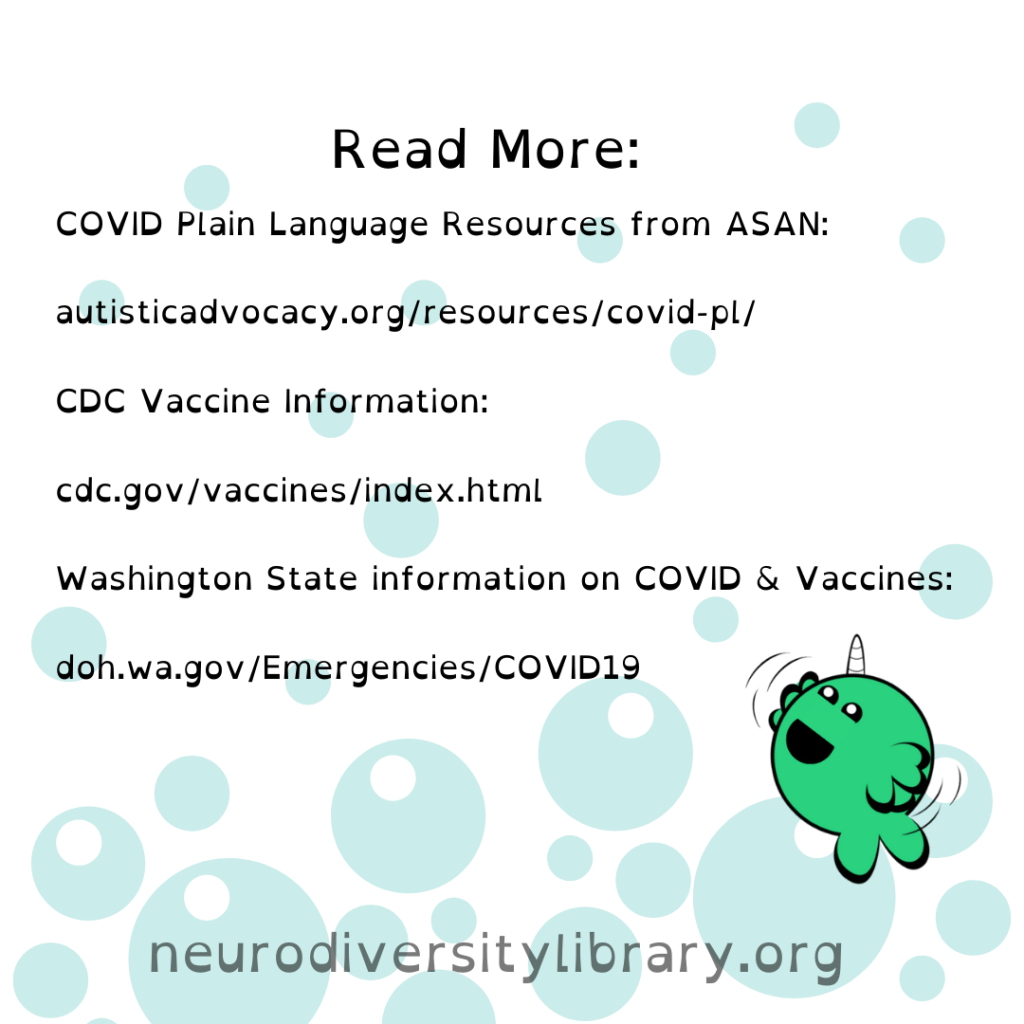 As of April, both of our neurodiversity librarians are fully vaccinated. However, we will continue to wear masks in any indoor meeting space until the mask mandate is lifted STATEWIDE in Washington state. We ask that all patrons do the same when meeting in public, indoor spaces. We do have family members who are either too young or otherwise unable to be vaccinated, and we want to continue to keep everybody safe.