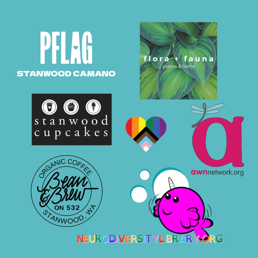Image: Logos of PFLAG Stanwood-Camano, Flora & Fauna, Bean & Brew on 532, Stanwood Cupcakes, Autistic Women & Nonbinary Network and Neurodiversitylibrary.org. Center of image is a heart with the Progress Pride colors.